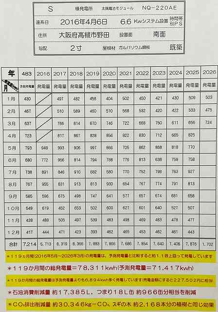 シャープ太陽光発電6.60kwシステムのお客様の発電量を確認しました。119ヵ月間の総発電量=78,311kwhです。結果、ご提案時の予測発電量よりも約6,894kwh多く発電しました。予測発電量と比較すると約1.1倍上回って発電しています。約10年間の売電金額に換算すると227,502円に相当します。太陽光エネルギーの発電のおかげでまさに太陽の恩恵、屋根裏貯金です。これを火力発電の石油消費削減量に換算すると約17,385Lつまり18L缶約966缶分相当を削減。CO₂排出削減量に換算すると約30,346kg-CO₂,スギの木約2,168本分の植樹と同じ効果になります。このような太陽光発電システムのご提案を望まれる方は、お気軽に是非ご連絡ください。